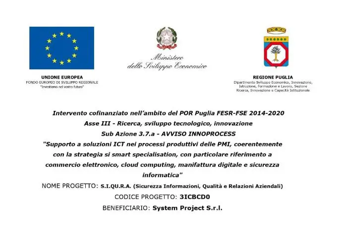 System Project Srl, ha sviluppato il Progetto S.I.QU.R.A. (Sicurezza Informazioni, Qualità e Relazioni Aziendali), approvato e cofinanziato dalla Regione Puglia Area Politiche per lo Sviluppo Economico, il Lavoro e l’Innovazione, nell’ambito del POR Puglia FESR-FSE 2014-2020, Asse III – Ricerca, sviluppo tecnologico, innovazione