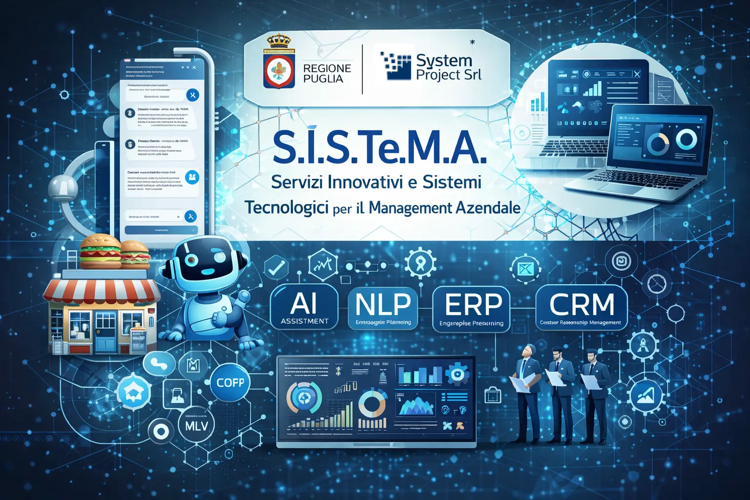 System Project Srl, ha sviluppato il Progetto S.I.S.Te.M.A. (Servizi Innovativi e Sistemi Tecnologici per il Management Aziendale), approvato e cofinanziato dalla Regione Puglia Sezione Crescita Digitale delle persone del territorio e delle imprese, Asse Prioritario I “Competitività e Innovazione” – Obiettivi specifici RSO1.1-RSO1.2 - Azioni 1.2-1.7 – sub-Azioni 1.2.1-1.7.7 - Avviso pubblico “TRASFORMAZIONI”